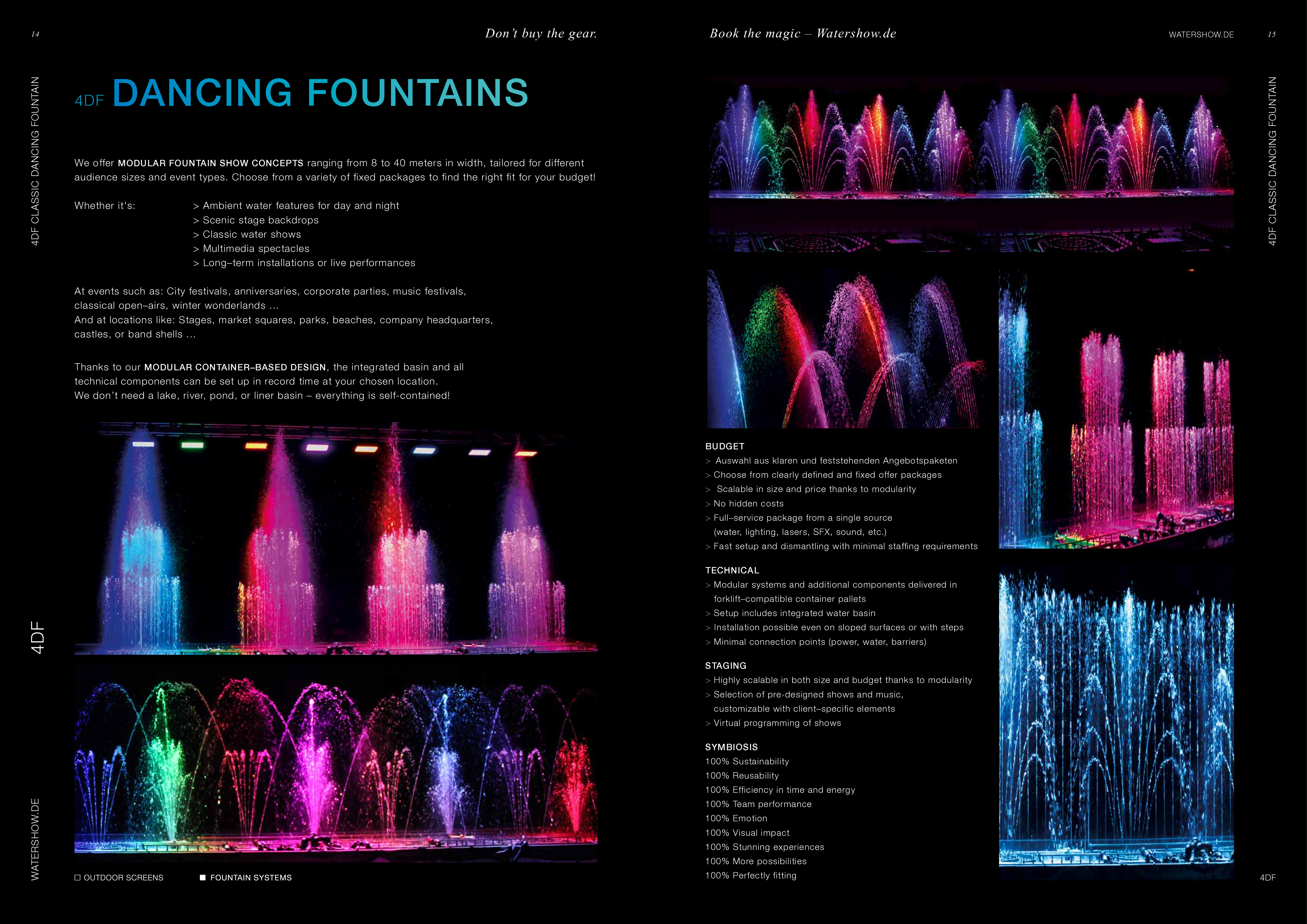 Watershow.de GmbH verwandelt Wasser in unvergessliche Erlebnisse. Von funkelnden Fontänen und eleganten Wasserwänden bis hin zu hochmodernen Wasserscreens, die Logos und Bilder mit fallenden Tropfen schreiben. Jede Show ist ein einzigartiges Highlight. Mit individuellen Lösungen, perfekter Technik und beeindruckender visueller Wirkung lässt Watershow.de Marken erstrahlen und Events unvergesslich werden.
